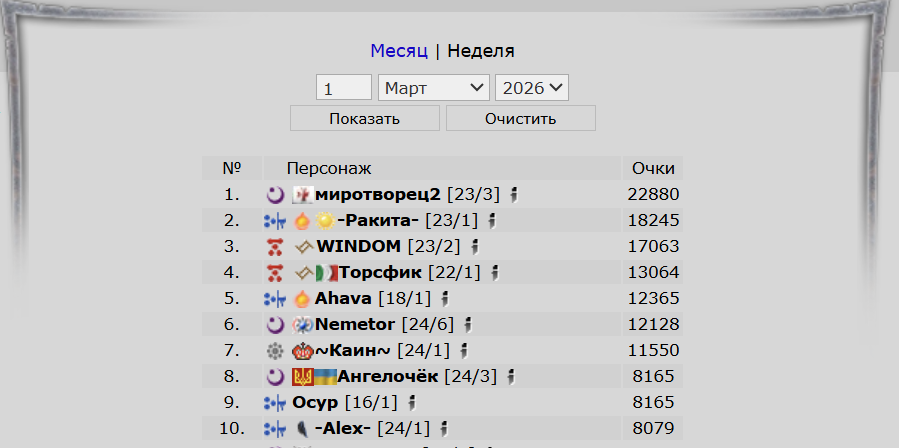 Во вкладке "Рейтинг" в здании гильдии можно посмотреть текущий рейтинг, он формируется на неделю и на месяц, топ-10 самых результативных согильдийцев обозначен зеленым цветом.