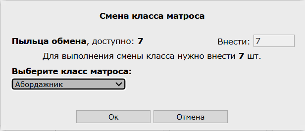 Смена класса происходит в резерве корабля, игроку нужно перенести туда матроса, которого он хочет изменить и нажать кнопку “Смена класса”. При нажатии открывается окошко для ввода пыльцы и выбора класса в выпадающем списке.