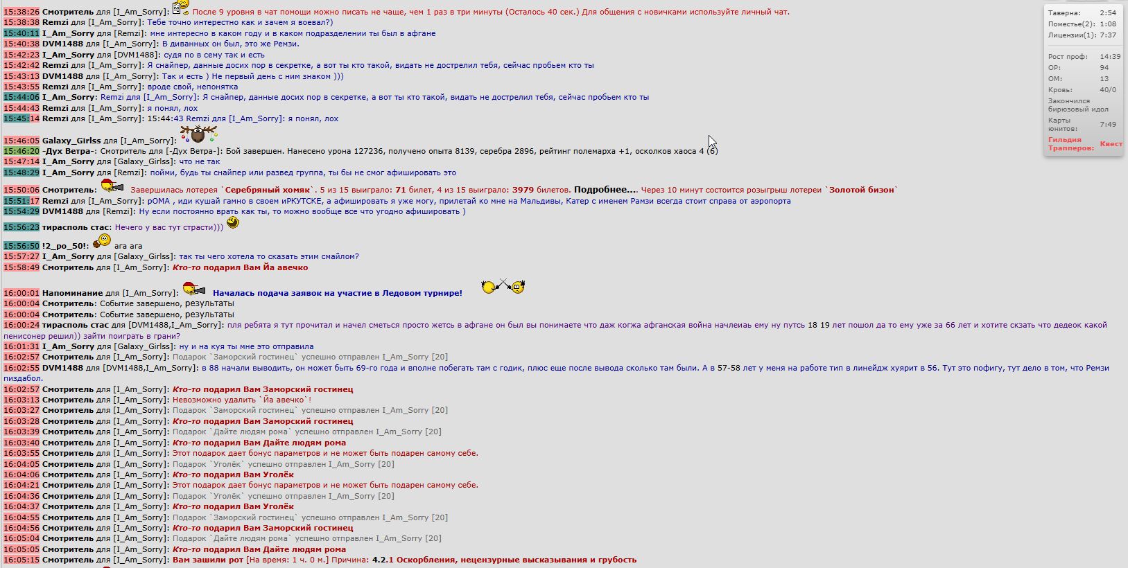 Посажен в тюрьму: Статья 4.2.2. Оскорбление, нецензурные высказывания и грубость, высказанные в подписи к подарку. Сервис жалоб: http://order.ereality.ru/ork/femida_ Вопросы по наказанию http://forum.ereality.ru/topic165249/page1.html [3 Д. 0 сер.], Дата: 20:13:00 30-09-2025 Неправомерная посадка персонажа.